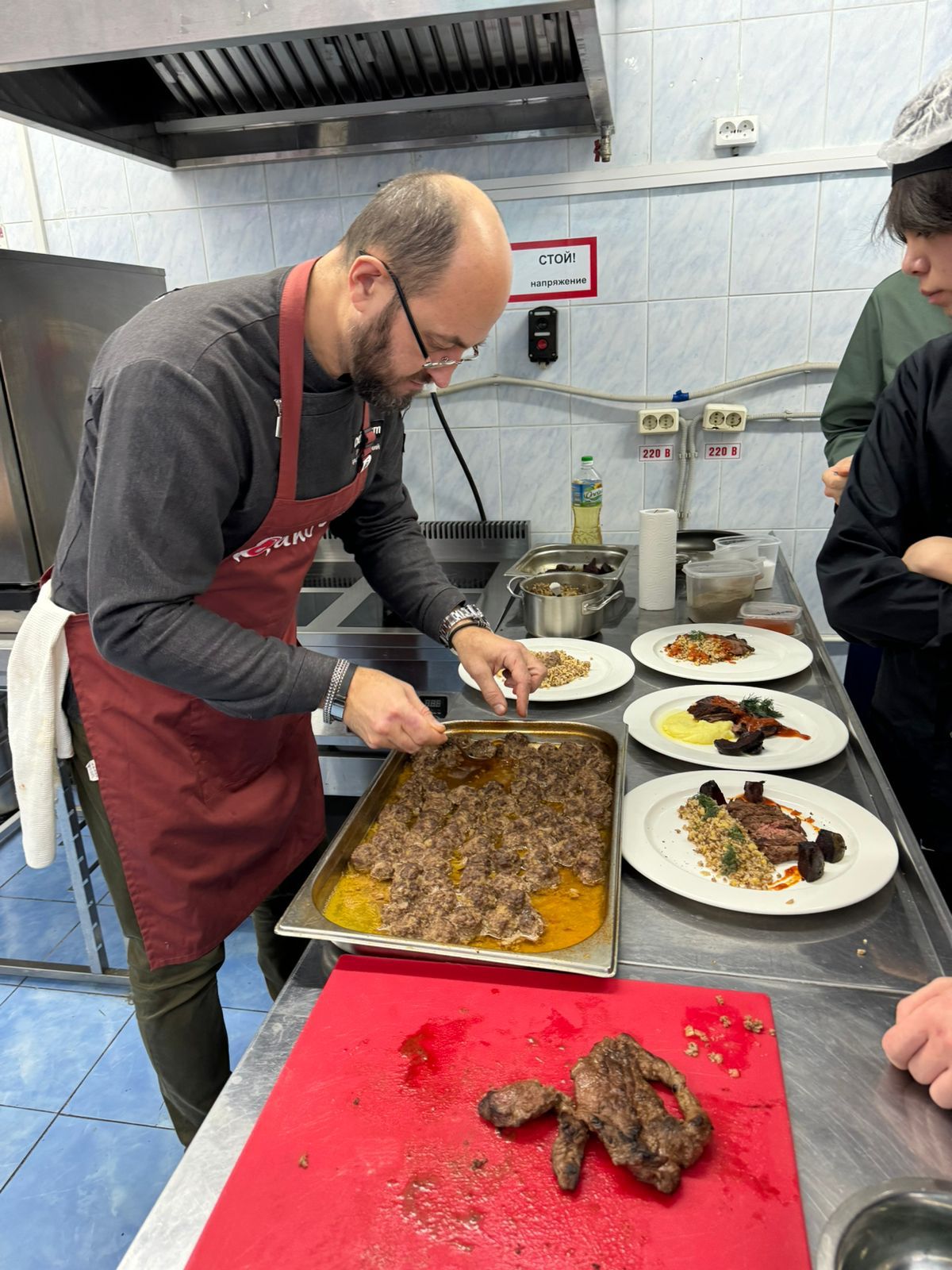 Мастер-класс от бренд шеф-повара Евгения Бердникова для студентов начался с того, что шеф рассказал об особенностях мяса северного оленя. Он объяснил, как правильно выбрать и хранить мясо, а также как подготовить его к приготовлению. Обсудили, какие специи и добавки лучше всего подходят к этому виду мяса, и как их правильно сочетать.