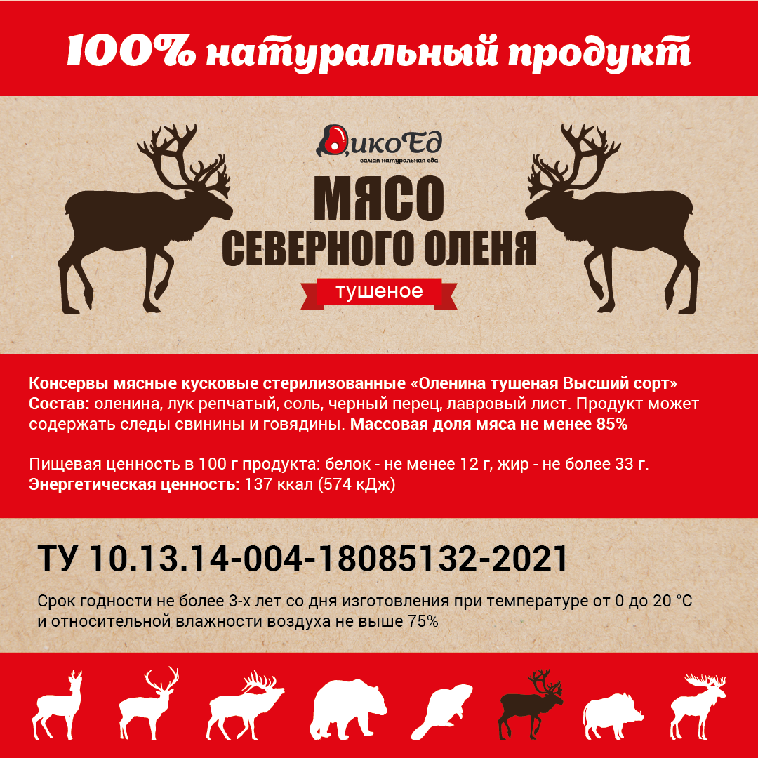 Дичь, Олень северный, Бакалея, Оленина, Мясные консервы, Тушеное мясо, Доставка Почтой России.