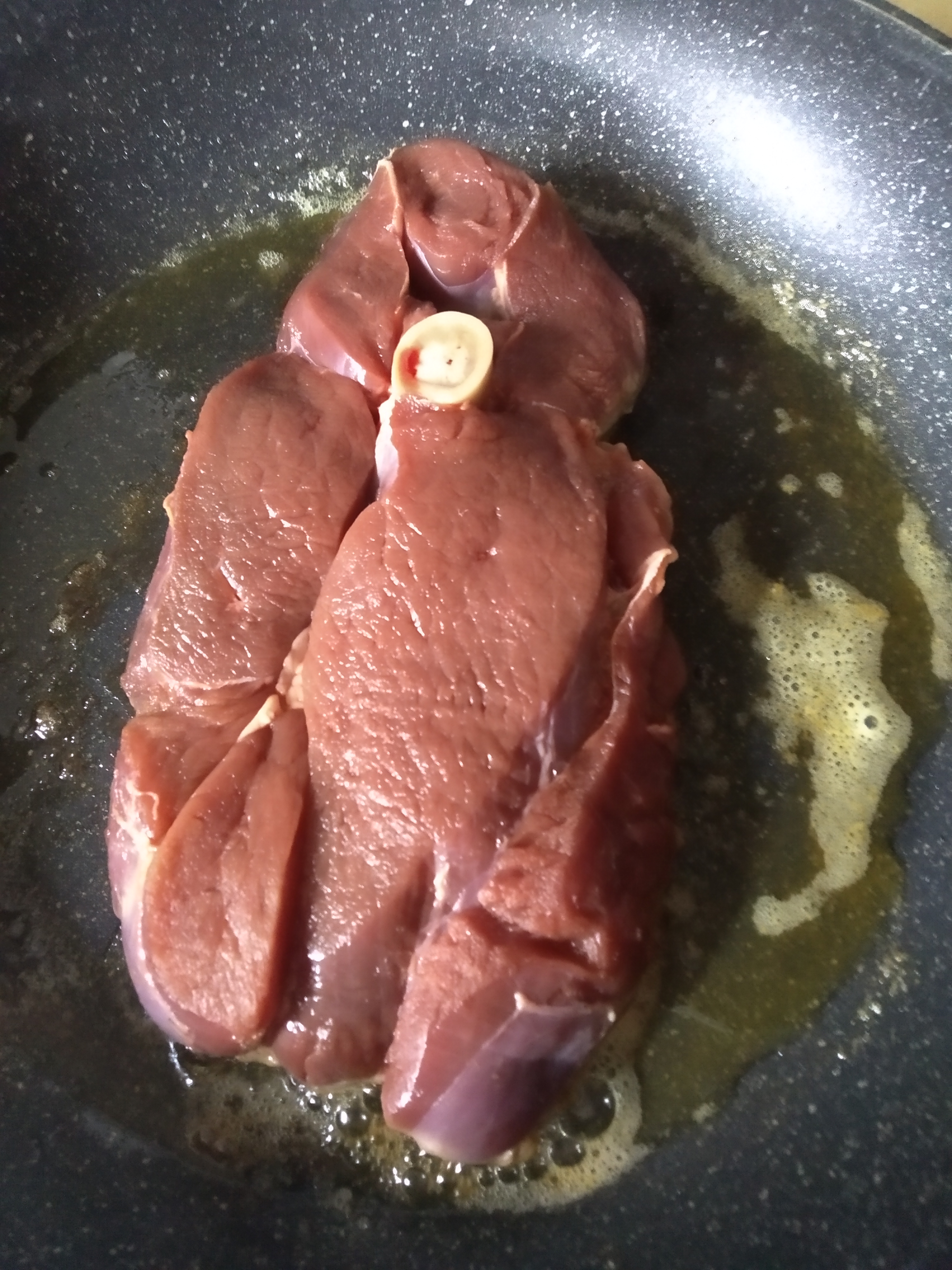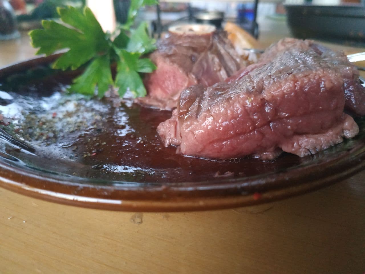 Стейк из окорока северного оленя на кости понравится всем любителям мясной кулинарии. Достаточно жесткое мясо, напоминающее говядину, при правильной кулинарной обработке приобретает нежность и мягкость. Для этого куски оленины отбивают, выдерживают в маринаде на основе оливкового масла. Для придания мясу сочности его перед обжариванием нашпиговывают кусочками свиного шпика. Особенно вкусными получатся такие стейки, запеченные на углях. Низкокалорийное мясо, имеющее сбалансированный состав белков-жиров-углеводов полезно при коррекции веса, спортивных, восстановительных диетах.